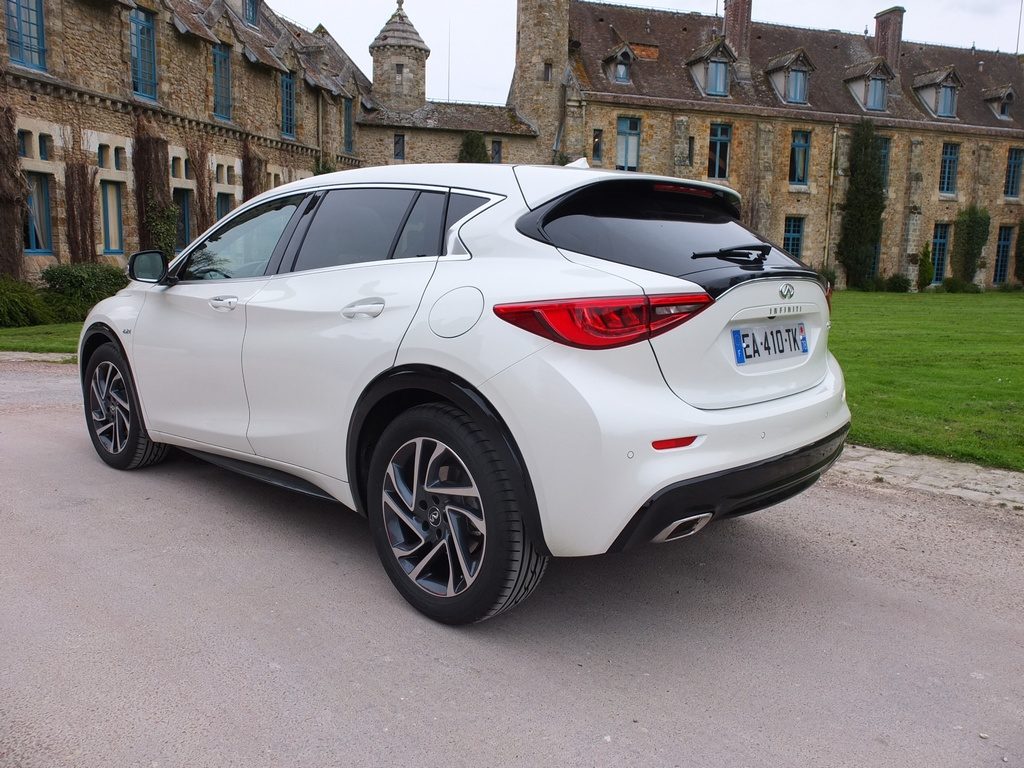 Ce design assez marqué chez Infiniti au niveau de la calandre et des lignes globales de l’auto est un vrai plus pour la marque. Cela lui permet d’imposer son style et de se démarquer un peu de la concurrence et probablement de rajeunir sa clientèle. Et même si je n’aime pas les SUV ni les bébés SUV (catégorie dans laquelle je classe cette Q30), je trouve que sur l’esthétique globale, cette Q30 sort du lot et plutôt positivement. En plus des petits détails de finition (sur ce modèle Q30 Tech Gallery White) lui donnent plus de caractère : sorties d’échappement rectangulaires, bas de caisse laqués noirs, les jantes …