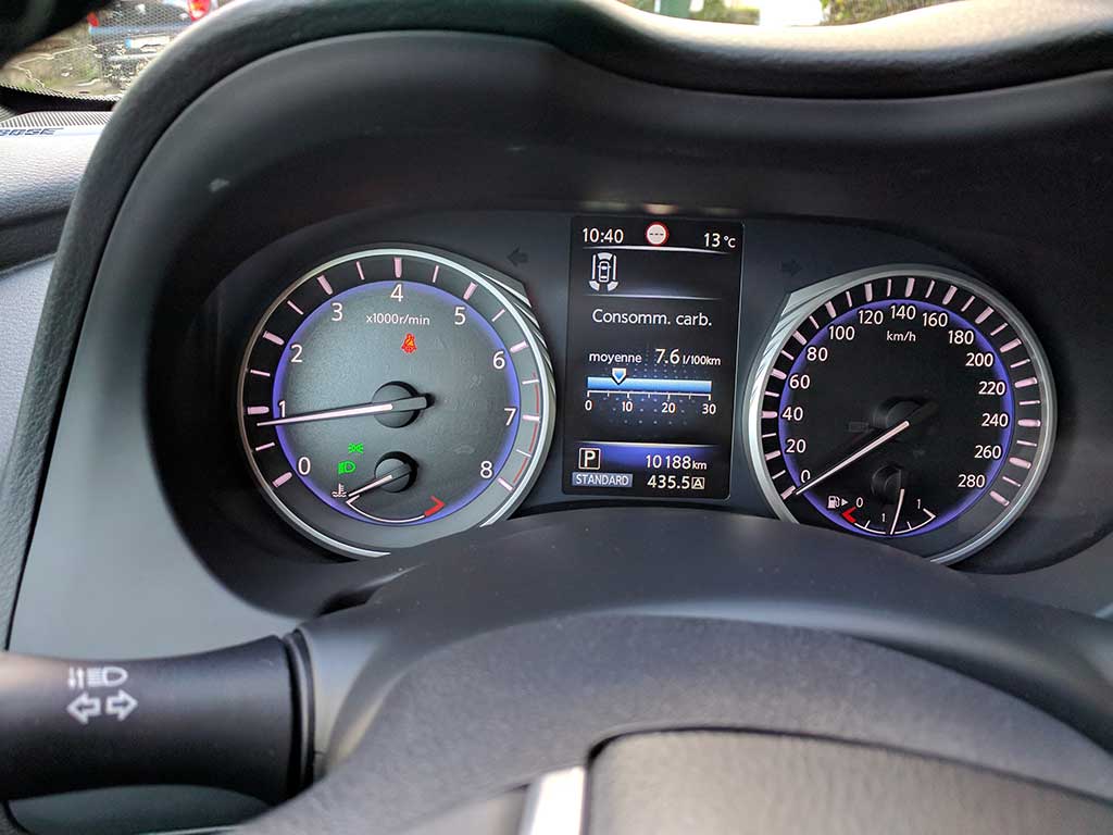Une dernière information utile, j’ai pris la voiture au parc presse d’Infiniti avec une consommation moyenne affichée au compteur de 10.5 l (tiens y en a un qui s’est amusé ou alors qui n’a mangé que du bouchon), je l’ai rendu avec une conso de 7.5 / 7.6 litres au 100 (sans forcer à faire des économies de carburant). On est un peu au dessus des indications du constructeur, mais je pense qu’on peut baisser cette moyenne une fois que l’on connait bien l’auto, sans pour autant se priver de se faire plaisir.