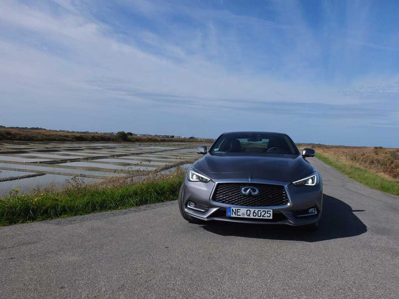 J’ai quand même cherché à pousser la voiture hors de sa zone de confort, je l’ai emmené sur les routes étroites, sinueuses et cabossées des marais salants de la presqu’île Guérandaise. Là le poids de la Q60 agit en sa défaveur, si le moteur peut suivre les sollicitations, le freinage et le surpoids rendent le jeu pas très confortable (ici la Peugeot 308 GTI aurait par contre été beaucoup plus à l’aise). Si l’on tente la même chose sur une jolie route de campagne bien entretenue, on prend par contre pas mal de plaisir.