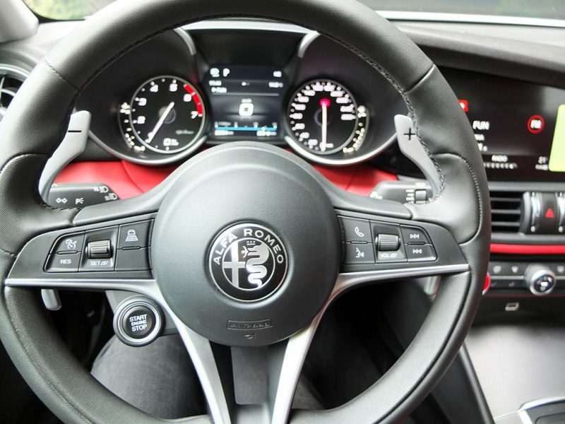 Dans l’ensemble c’est quand même une jolie réussite ce design, finalement moins agressif que la Peugeot 508 qui vient de se relancer sur le créneau, mais plus sensuel. Et puis il y a toujours un je-ne-sais-quoi avec la marque Alfa Romeo qui ne s’explique pas toujours (et sans parler des alfistes purs et durs). Alors que je croisais d’anciens collègues, je leur disais que j’essayais une voiture pendant 3 jours sur la région en montrant la clé de l’Alfa, et au moment d’associer la clé au nom « Giulia », je vois leur regard s’illuminer. J’aurais fait la même chose avec une clé de BMW série 3, cela n’aurait probablement suscité aucune émotion particulière… mais la Giulia provoque quelque chose, et c’est aussi ça que l’on recherche quand on choisit un modèle un peu moins « mainstream ».