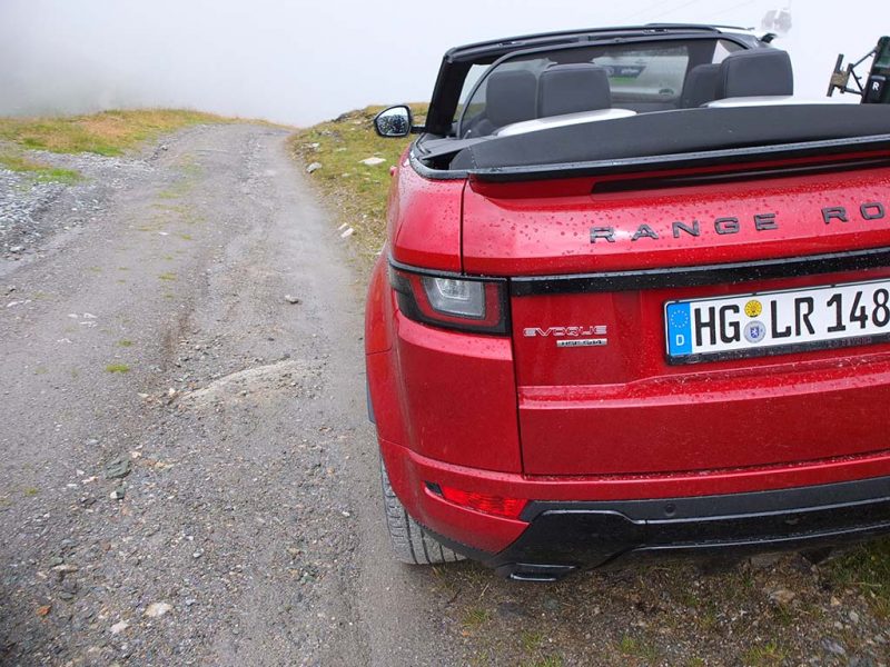 Pour cet essai j’ai eu la motorisation 180ch diesel entre les mains avec sa boite automatique 9 rapports. Diesel et cabriolet ne font pas toujours bon ménage mais dans le cas présent la cohabitation fonctionne bien. Ce moteur reste assez discret, la boîte semble lui apporter beaucoup de souplesse, mais il faut dire que je ne l’ai pas beaucoup poussé car notre petite virée en Evoque Cab’ se faisait entre la station de la Plagne Bellecôte (un peu moins de 2000m d’altitude) et les shelters du Land Rover Experience placé sur le sommet de la Roche de Mio à 2600 m via des pistes de montagne.